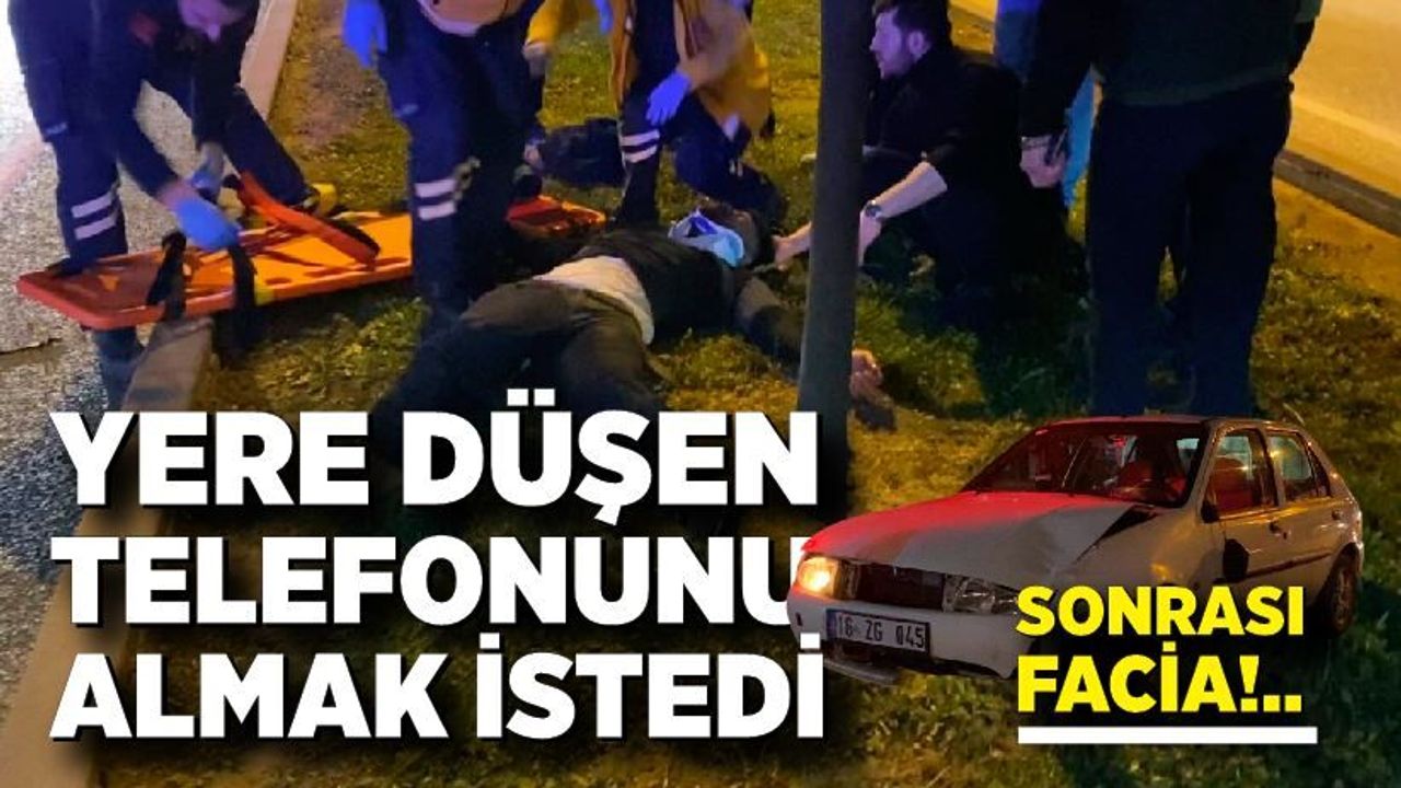 Bursa'nın İnegöl ilçesinde meydana gelen kazada, karşıdan karşıya geçerken karayolu üzerinde düşürdüğü telefonunu yerden alırken otomobilin çarptığı adam ağır yaralandı. Kaza anı bir işyerinin güvenlik kamerasına saniye saniye yansıdı.