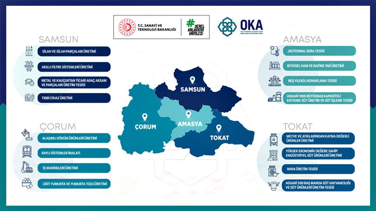 Amasya: Jeotermal sera tesisi, bitkisel ham ve rafine yağ üretimi, beş yıldızlı konaklama tesisi, asgari 1000 büyükbaş kapasiteli entegre süt üretim ve süt işleme tesisi.