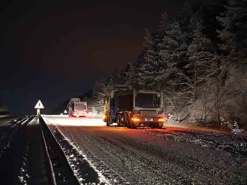 Kastamonu’da akşam saatleri itibarıyla etkili olan kar yağışı ulaşımı olumsuz etkiliyor. Kastamonu-İnebolu karayolu Oyrak mevkiinde yoğun kar yağışı ve buzlanma sebebiyle bazı araçlar yolda kaldı. Yolun iki şeridinde de tır ve kamyonların yolda mahsur kalması sebebiyle uzun araç kuyruğu oluştu.