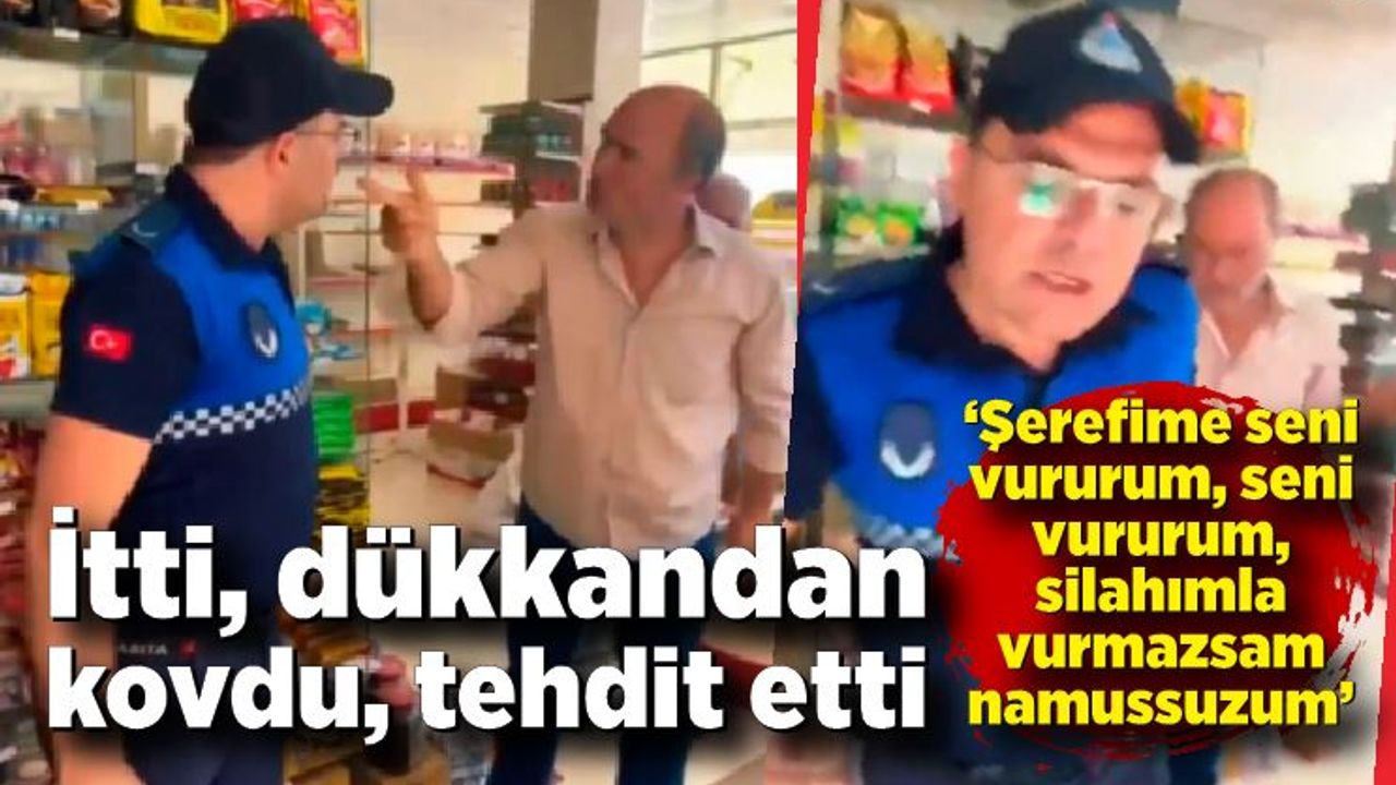 Bu sırada duruma tepki gösteren market işletmecisi şahıs, zabıta ekibini önce kovdu, sonra fiziki müdahale ile dışarı attı, ardından da "Şerefime seni vururum, seni vururum, silahımla vurmazsam namussuzum" diyerek tehdit etti. O anlar ise bir diğer zabıta memuru tarafından cep telefonu ile kaydedildi