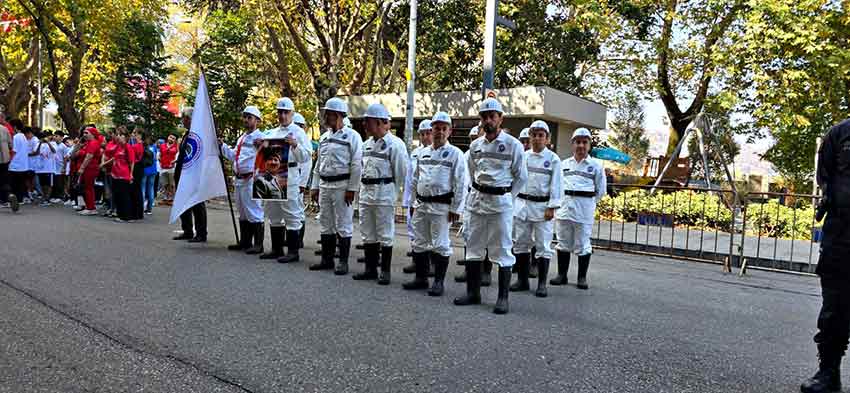 Madenciler, iş kıyafetleriyle kortejde yürürken vatandaşlar tarafından uzun süre alkışlandı.