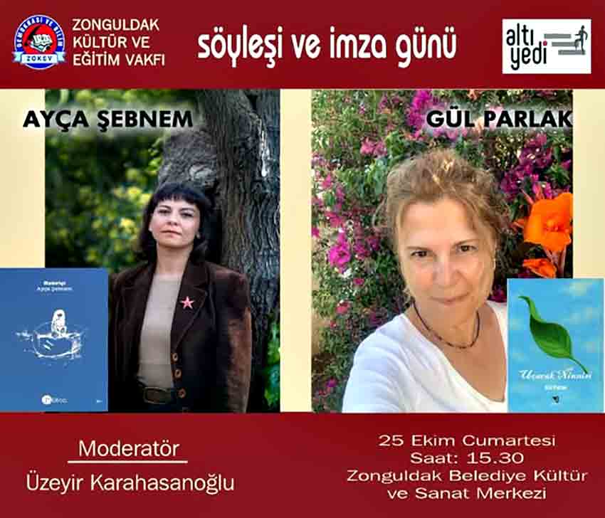 “Birçok Zonguldaklının ismini bildiği, yolu Zonguldak’tan geçmiş bir Diş Hekimi Ayça Şebnem. Şimdilerde mesken tuttuğu Ege kentinden, ilk şiir kitabı “Hatıriçi”ni imzalamak için geliyor. Gül Parlak’ın “Uçacak Ninnisi” de bir ilk kitap, Karaburun Sanat Kampı ödüllü hem de. Biri şair, diğeri öykücü iki kadının ilk kitapları üzerine konuşacağımız söyleşinin yöneticiliğini edebiyatın Zonguldak’taki karıncası Üzeyir Karahasanoğlu yapıyor. ZOKEV’in bu yılki ikinci etkinliğinde hatırlı hatıralar biriktirip edebiyatın insanı iyileştiren havasını solurken, geleceğe iz bırakacak iki yazın insanının ilk adımlarına tanık olacağız belki de…”