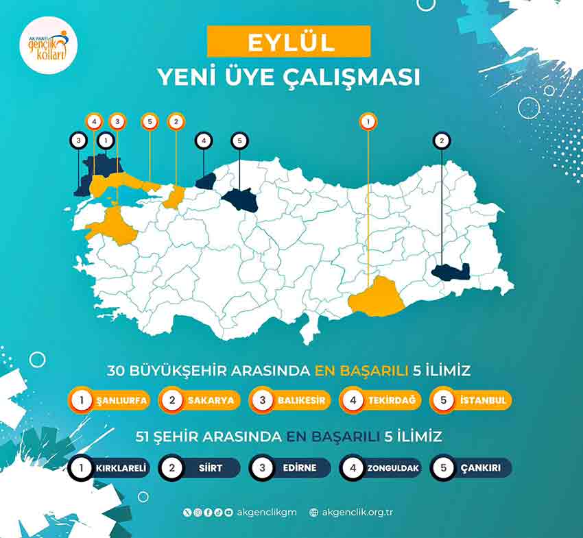 “Türkiye genelinde 51 şehir arasında yapılan Eylül ayı yeni üye çalışmasında AK Genç Zonguldak olarak 4. sırada yer almanın gururunu yaşıyoruz! Bu başarı; gece gündüz demeden çalışan teşkilatımızın, dava yolunda gönül veren kardeşlerimizin azmi ve samimiyeti sayesinde mümkün olmuştur.