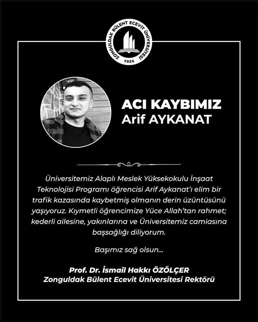 Kentte üzüntü yaratan bu gelişmenin hemen ardından bir başka acı haber daha geldi. Aynı üniversitenin Alaplı Meslek Yüksekokulu İnşaat Teknolojisi Programı öğrencisi Arif Aykanat, sabah saatlerinde geçirdiği trafik kazasında hayatını kaybetti.