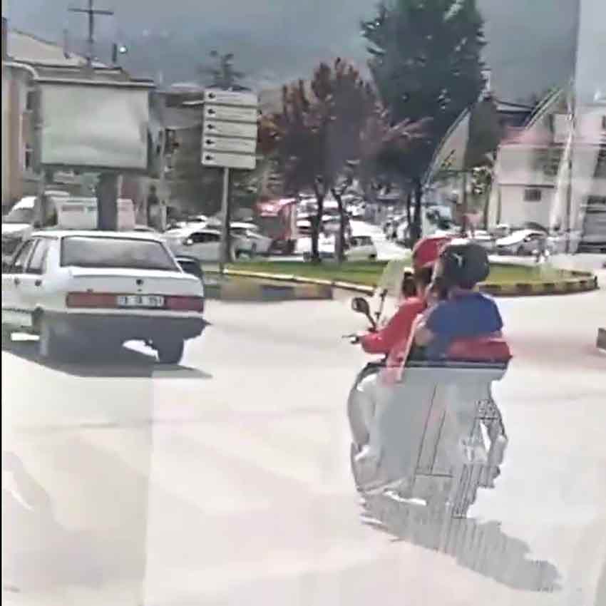 Olay, Zonguldak Caddesi Cuma Pazarı mevkiinde meydana geldi. Bir motosiklet sürücüsünün 3 çocukla birlikte yaptığı yolculuğu görenler büyük şaşkınlık yaşadı.