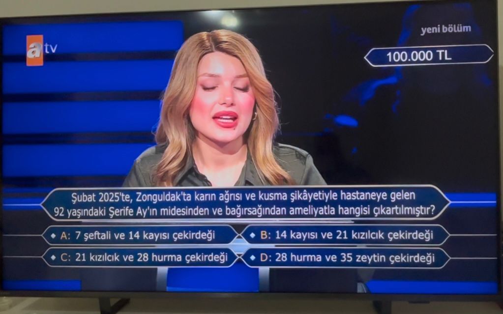 100 bin TL'lik soru olarak yarışmacı Kader Yıldız'a sorulan soruda, "Şubat 2025’te, Zonguldak’ta karın ağrısı ve kusma şikâyetiyle hastaneye gelen 92 yaşındaki Şerife Ay’ın midesinden ve bağırsağından ameliyatla hangisi çıkartılmıştır?" denildi.