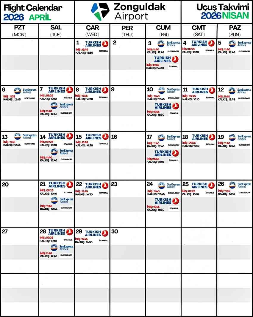Zonguldak Havalimanı yetkililerinden alınan bilgiye göre, Türk Hava Yolları (THY) ve SunExpress, Nisan ayında Zonguldak’tan karşılıklı uçuş programını açıklayarak yolculara ulaşım kolaylığı sağlayacak.