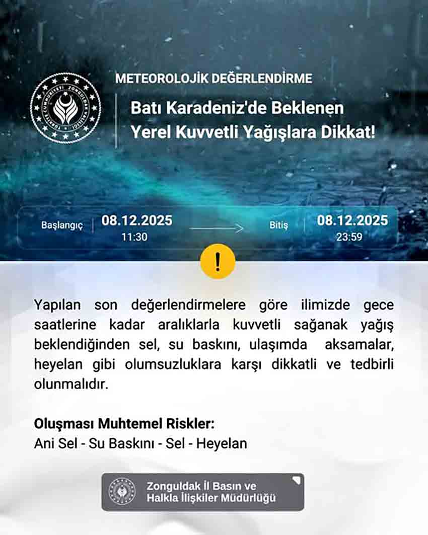 Meteoroloji Genel Müdürlüğü, Batı Karadeniz’de beklenen yerel kuvvetli yağışlar nedeniyle Zonguldak için uyarıda bulundu. Yapılan son değerlendirmelere göre il genelinde 08 Aralık 2025 saat 11.30 ile 23.59 arasında aralıklarla kuvvetli sağanak yağış etkili olacak.