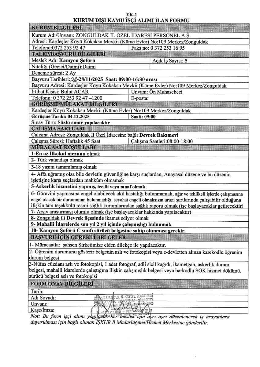 onguldak İl Özel İdaresi 70’in Üzerinde Personel Alacak