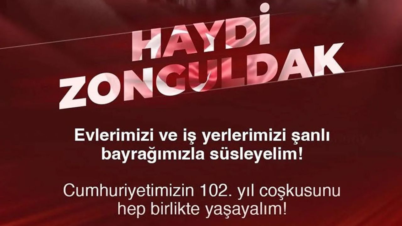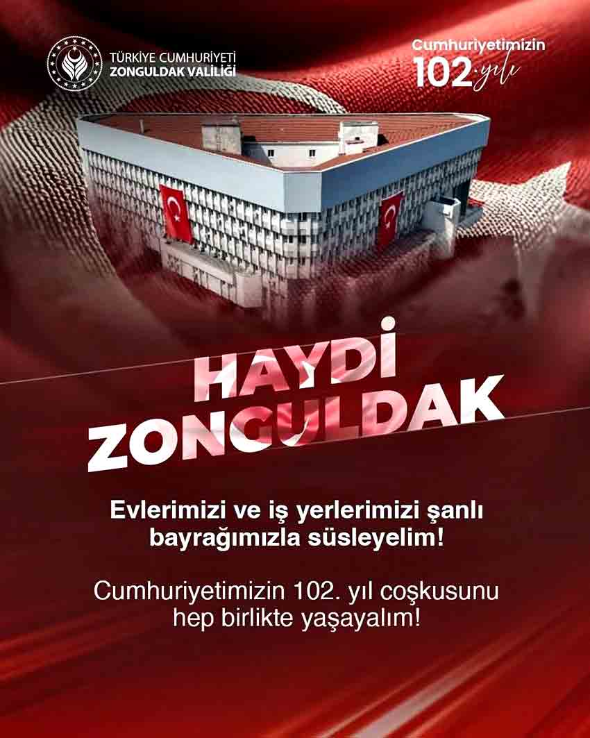 Zonguldak’ta 29 Ekim Cumhuriyet Bayramı coşkuyla kutlanacak. Cumhuriyet’in 102. yılı kapsamında Zonguldak Valiliği, tüm vatandaşları ev ve işyerlerini Türk bayraklarıyla donatmaya davet etti. Valilikten yapılan açıklamada: “Haydi Zonguldak. Ellerimizi ve iş yerlerimizi şanlı bayrağımızla süsleyelim. Cumhuriyetimizin 102. yıl coşkusunu hep birlikte yaşayalım” denildi.