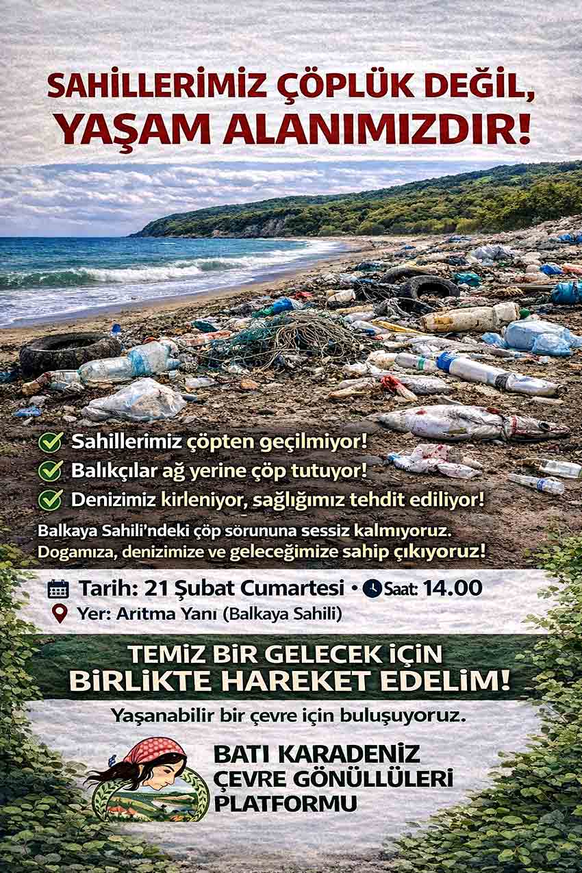 Platform tarafından hazırlanan afişte, sahillerde çöp yoğunluğunun giderek arttığı vurgulandı. Açıklamada, balıkçıların ağ yerine çöp tuttuğu, deniz ekosisteminin hızla zarar gördüğü ve kirliliğin halk sağlığını tehdit ettiği ifade edildi.