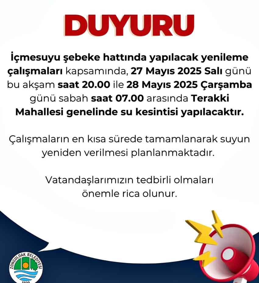 Zonguldak Belediyesi tarafından yapılan duyuruya göre, içmesuyu şebeke hattında gerçekleştirilecek yenileme çalışmaları nedeniyle 27 Mayıs 2025 Salı günü saat 20.00 ile 28 Mayıs 2025 Çarşamba günü saat 07.00 arasında Terakki Mahallesi genelinde su kesintisi uygulanacak.