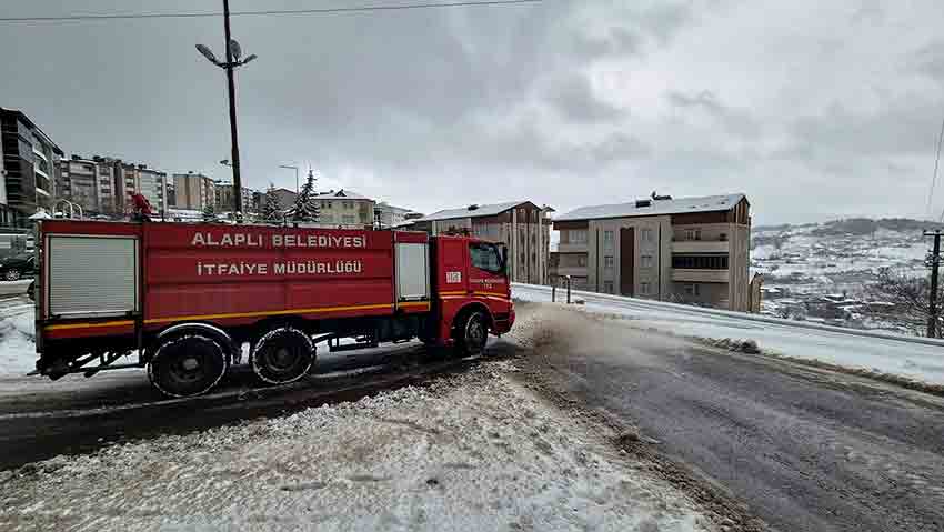 Gece saatlerinde etkisini artıran kar yağışıyla birlikte Alaplı Belediyesi itfaiye ekipleri, denizden çekilen suyla karlı kaplı yolları yıkayarak ulaşıma açtı. İtfaiye araçları ve iş makineleri, ana arterler başta olmak üzere hastane ve 112 Acil Servis yollarında aralıksız çalışma yürüttü.