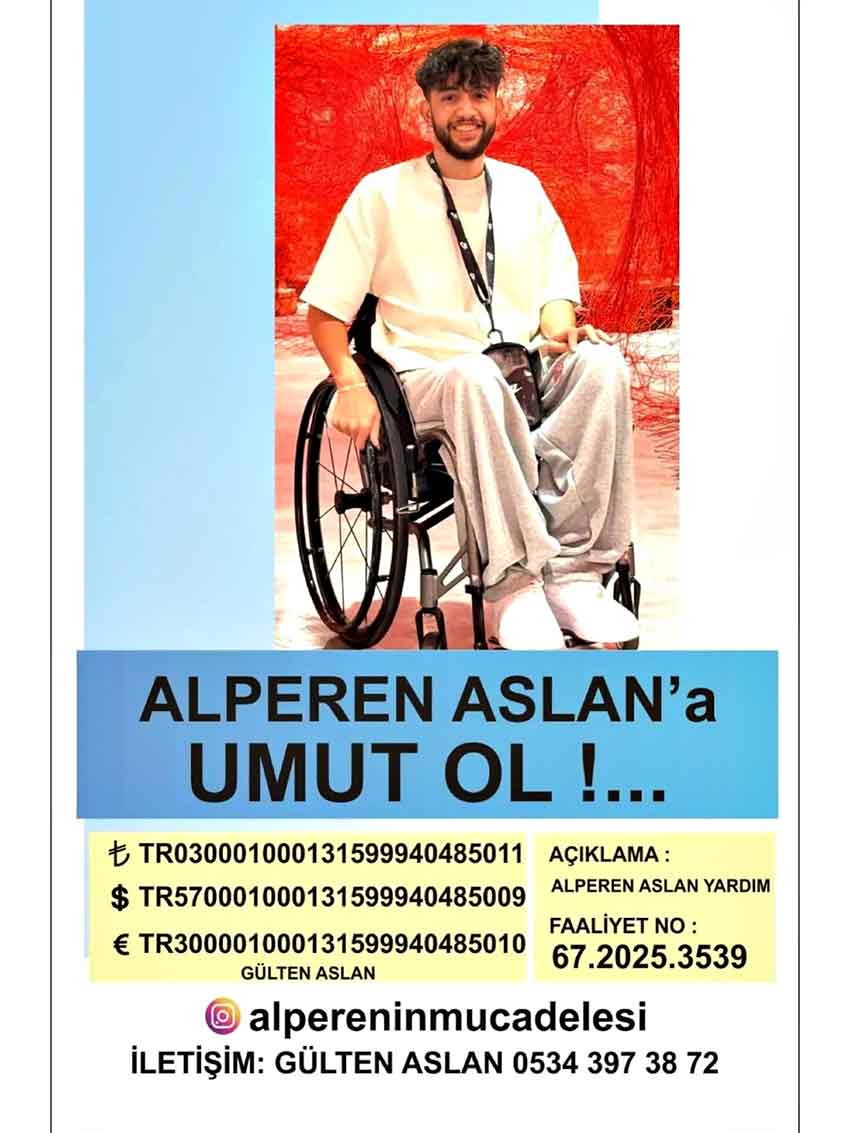 Zonguldak’ta yaşayan 2001 doğumlu doğuştan işitme engelli Alperen Aslan, 2021 yılında evinin balkonundan düşerek geçirdiği kazada omurilik felci geçirdi. Genç yaşında tekerlekli sandalyeye mahkûm kalan Alperen’in tekrar ayağa kalkabilmesi için yurt dışında yapılacak epidural stimülasyon ameliyatına ihtiyacı var. Ancak 65 bin dolar tutarındaki tedavi masraflarını karşılayacak maddi gücü bulunmayan Aslan, Valilik onaylı kampanya aracılığıyla hayırseverlerden destek bekliyor.