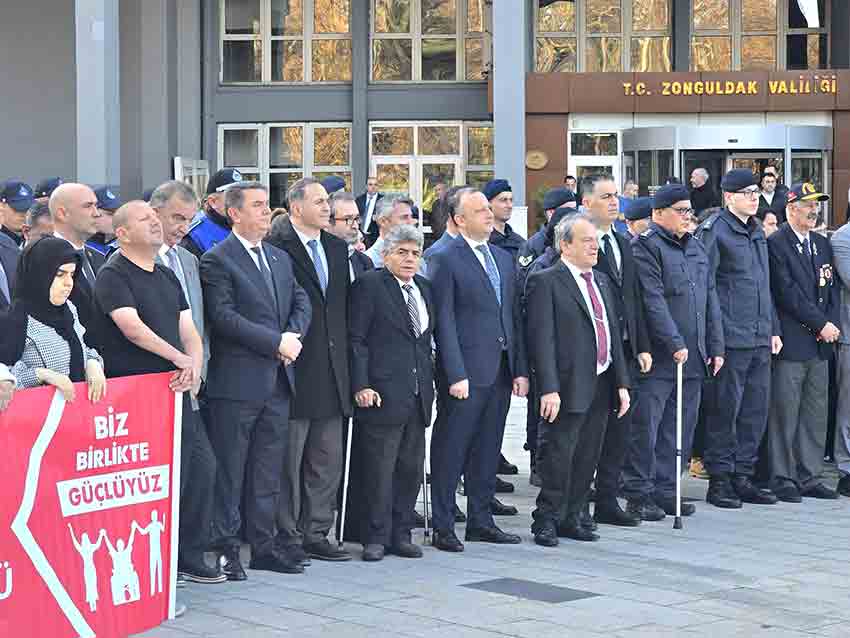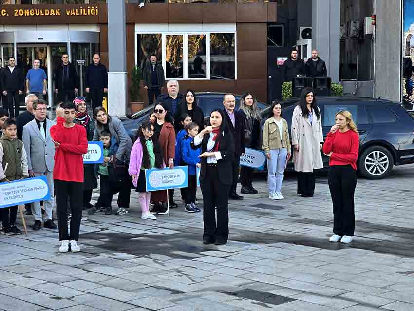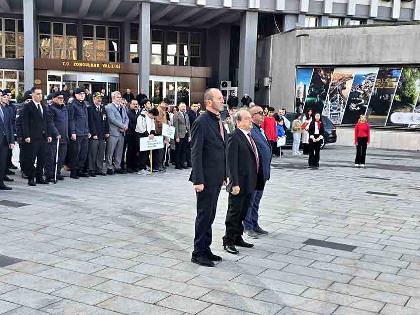 Törende Türkiye Sakatlar Derneği Zonguldak Şubesi Başkanlığı tarafindan Atatürk Anıtına çelenk sunuldu. Saygı duruşuna müteakiben öğretmenler tarafından işaret dili ile İstiklal marşı icra edildi