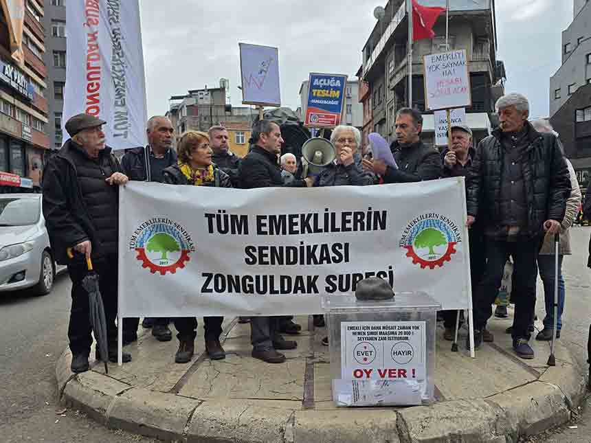 Tüm Emeklilerin Sendikası Zonguldak Şubesi, artan maliyetlere ve ekonomik krize tepki göstermek amacıyla meydanlara indi. Tüm Emeklilerin Sendikası 20 bin TL seyyanen zam talebiyle Madenci Anıtı’nda buluştu. Sloganlar, alkışlar ve pankartlar eşliğinde gerçekleşen yürüyüşte emekliler hükümete seslendi. Tüm Emeklilerin Sendikası Zonguldak Şubesi tarafından düzenlenen basın açıklamasına çok sayıda emekli katıldı. Basın açıklamasını yapan Tüm Emeklilerin Sendikası Zonguldak Şube Başkanı Mahmut Kılıç, emeklilerin talep ettiği zammın bir lütuf ya da ayrıcalık değil, temel bir yaşam hakkı olduğunu vurguladı.