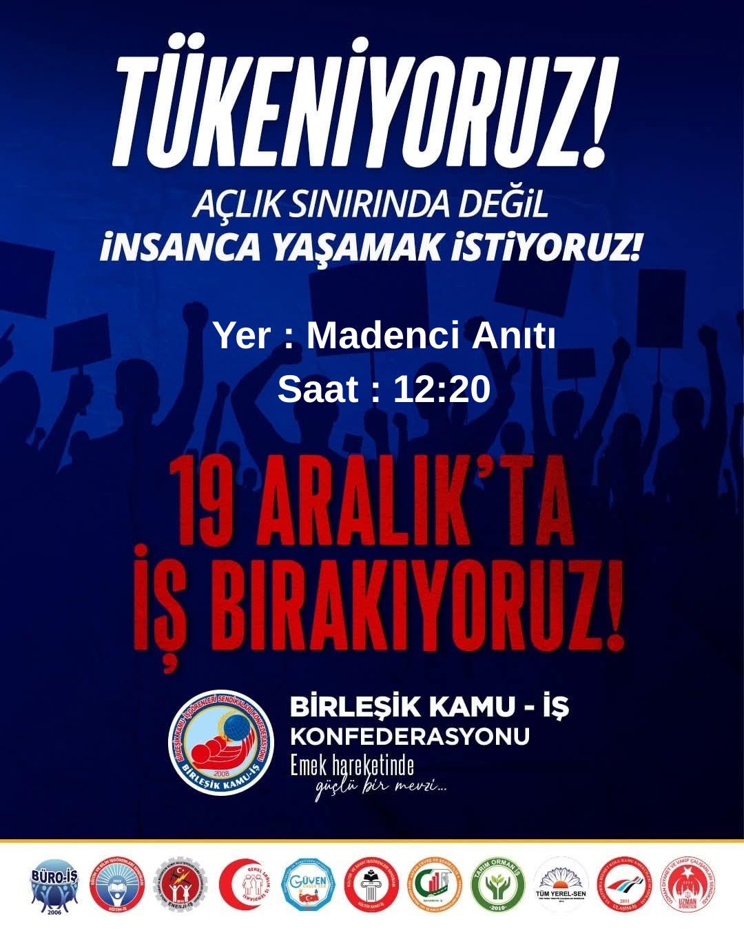 Birleşik Kamu-İş Başkanı Metin Kahveci, 19 Aralık Cuma günü saat 12.20’de iş bırakılacağını ve işçi anıtında basın açıklaması yapılacağını duyurarak, tüm kamu çalışanları ve emeklileri mücadeleye davet etti.