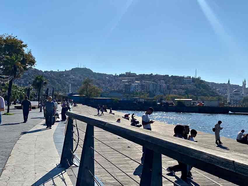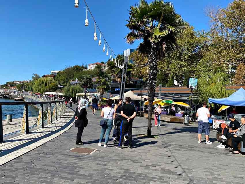 Deniz kenarında oturanlar çay eşliğinde sohbet ederken, bazıları sokak müzisyenlerinin çaldığı şarkılara eşlik ederek eğlenceli anlar yaşadı.