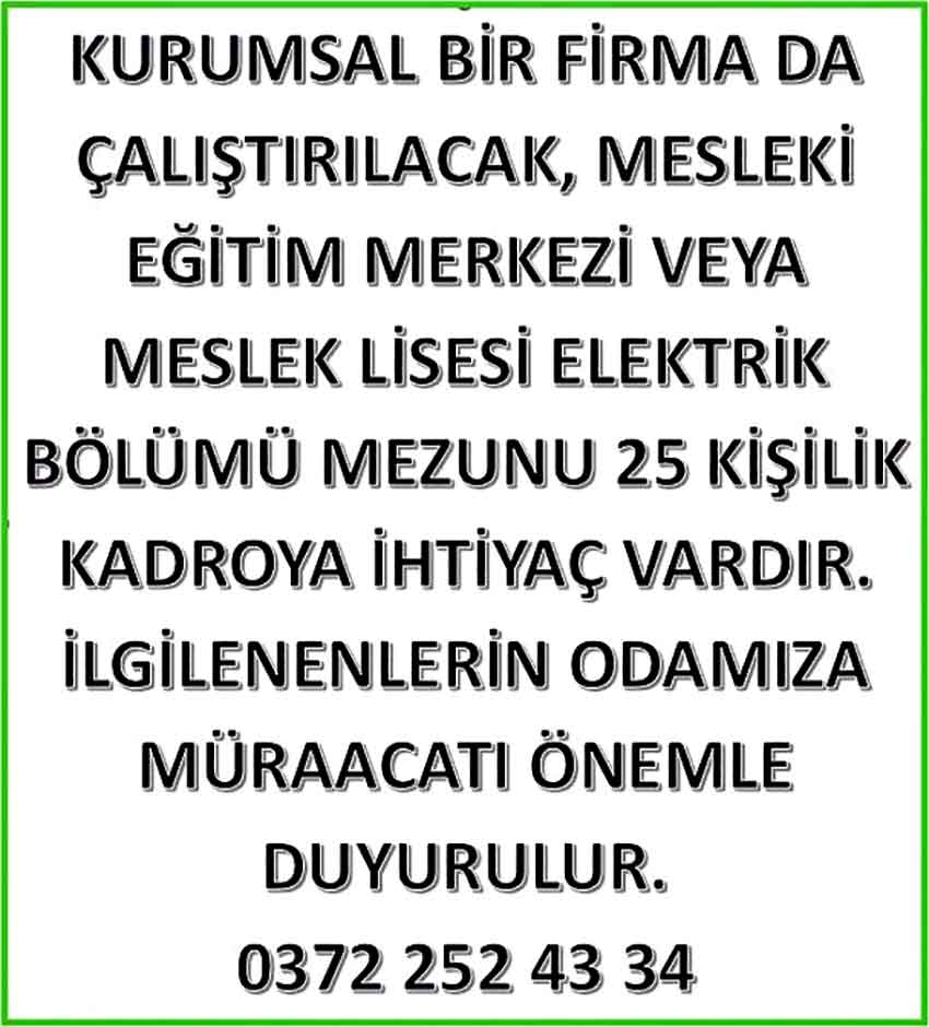 Zonguldak Elektrikçiler Odası, kurumsal bir firmada çalıştırılacak Mesleki Eğitim Merkezi veya Meslek Lisesi Elektrik Bölümü mezunu 25 kişilik kadro için başvuru alacak. Başvuruların Zonguldak Elektrikçiler Odası'na yapılması gerektiği belirtildi.