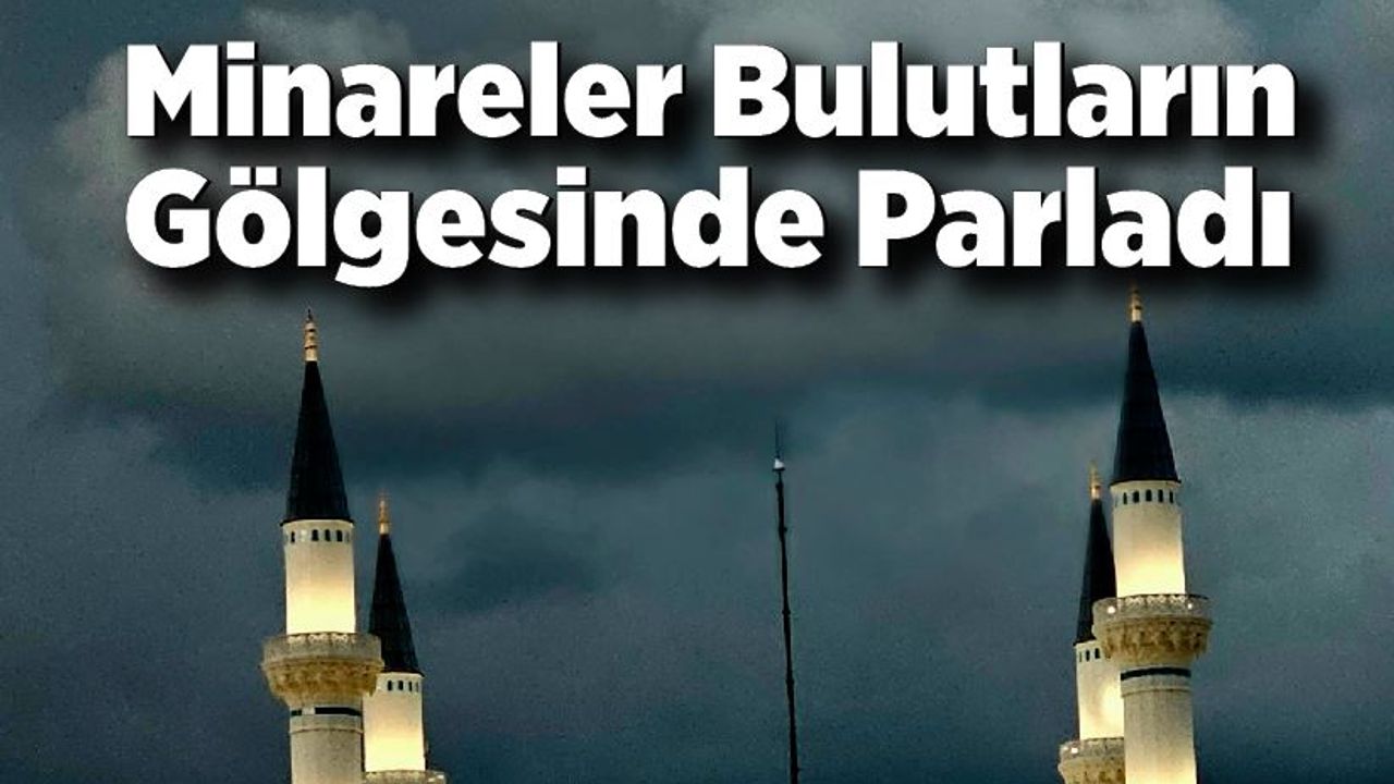 Gökyüzünün karanlık tonlarına rağmen cami minarelerinin aydınlatmaları geceyi aydınlatan birer ışık gibi öne çıktı. Bu kontrast, hem dini mimarinin zarafetini hem de doğanın ihtişamını aynı karede bir araya getirdi.