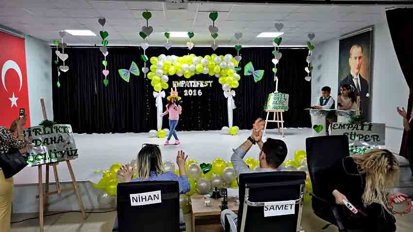 Okulun rehberlik servisi tarafından spor salonunda organize edilen etkinlikte, öğrenciler kendi elleriyle tasarladıkları "empati şapkalarını" takarak sahneye çıktı. Arkadaşlarının farklılıklarını görebilmek ve onların duygularını daha iyi anlayabilmek amacıyla tasarlanan şapkalar, üretkenlikte sınır tanımadı. Minik öğrenciler şapkalarını oyuncak, şeker, ponpon, toka gibi çeşitli eşyalarla süsleyerek okul bahçesinde rengarenk bir atmosfer oluşturdu.