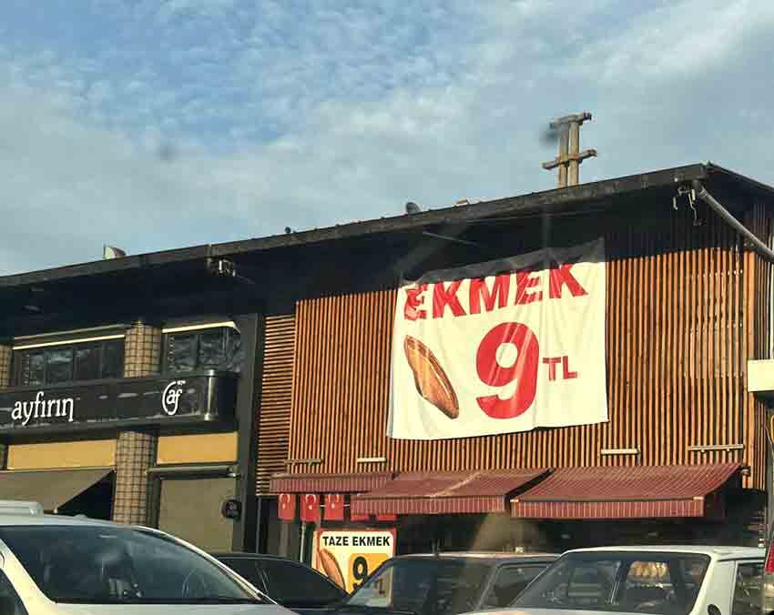 Fırın sahibi, ekmek fiyatlarındaki indirimi duyurmak için büyük bir pankart asarak kampanyanın tanıtımını yaptı. Fırının dışındaki pankartta, "Ekmek 9 TL" yazısı yer alıyor.