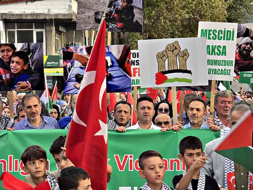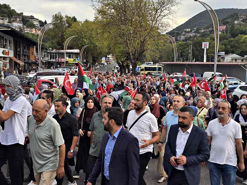 İsrail’e tepki göstermek ve Filistin’e destek vermek amacıyla gerçekleştirilen yürüyüş, İstasyon Caddesi’nde başladı. Platform üyeleri, ellerinde pankartlarla Madenci Anıtı’na kadar yürüdü.