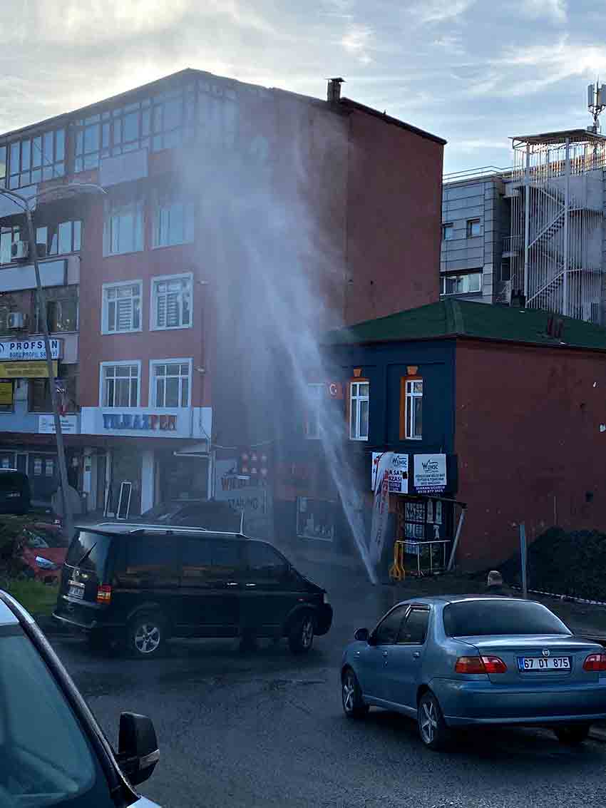 Zonguldak’ın Terakki Mahallesi Soğuksu semtinde ana yolda su borusu patladı, patlayan borudan fışkıran tazyikli su kısa sürede caddeyi kapladı.