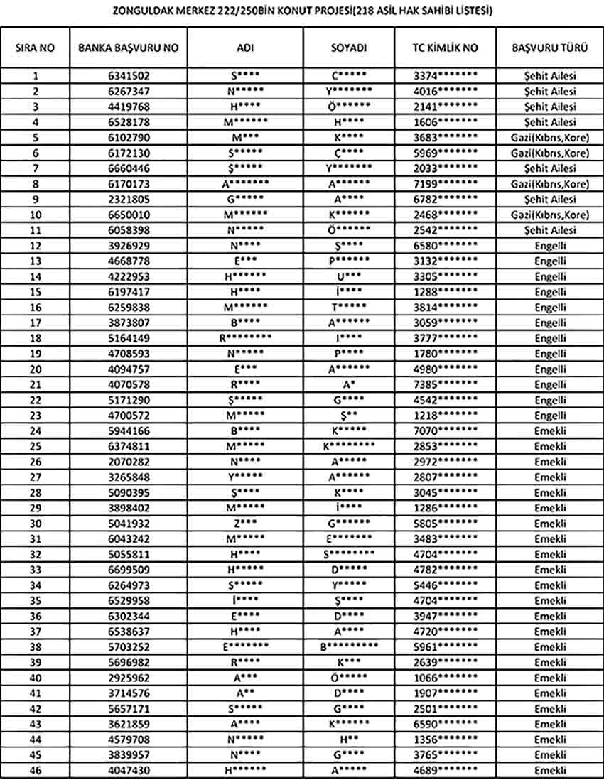 ZONGULDAK MERKEZ 222/250BİN KONUT PROJESİ(218 ASİL HAK SAHİBİ LİSTESİ