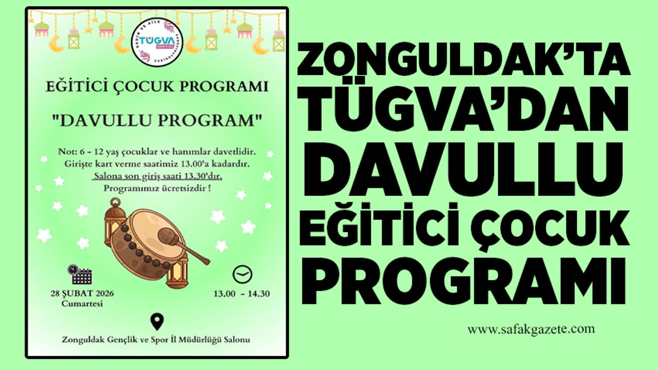Türkiye Gençlik Vakfı (TÜGVA) Zonguldak İl Başkanlığı ve Kadın-Aile Koordinatörlüğü, ortaokul çocuklarına yönelik davullu “Eğitici Çocuk Programı” hazırladı. Program, Zonguldak Gençlik ve Spor İl Müdürlüğü Salonu’nda 28 Şubat Cumartesi günü 13.00-14.30 saatleri arasında gerçekleşecek ve halka açık olacak.