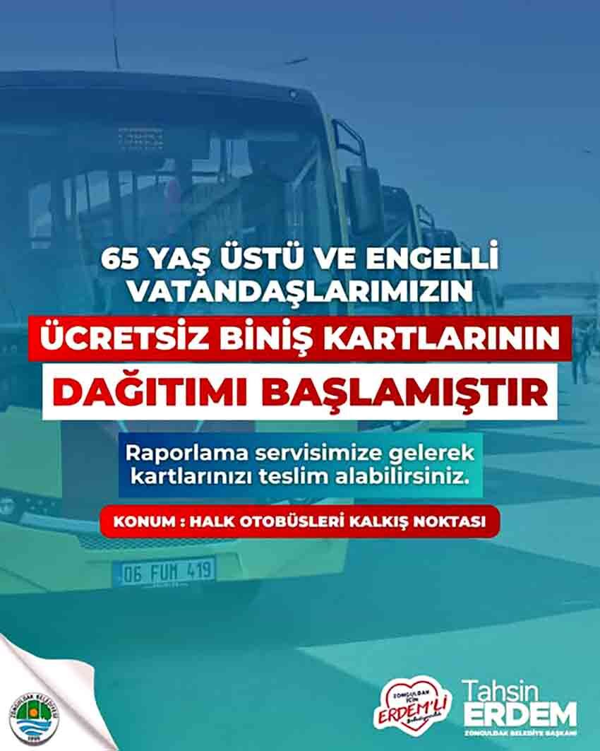 Zonguldak Belediyesi, geçtiğimiz hafta hizmete giren halk otobüsü uygulaması kapsamında, 65 yaş üstü ve engelli vatandaşlara ücretsiz biniş kartlarının dağıtımına başladı.