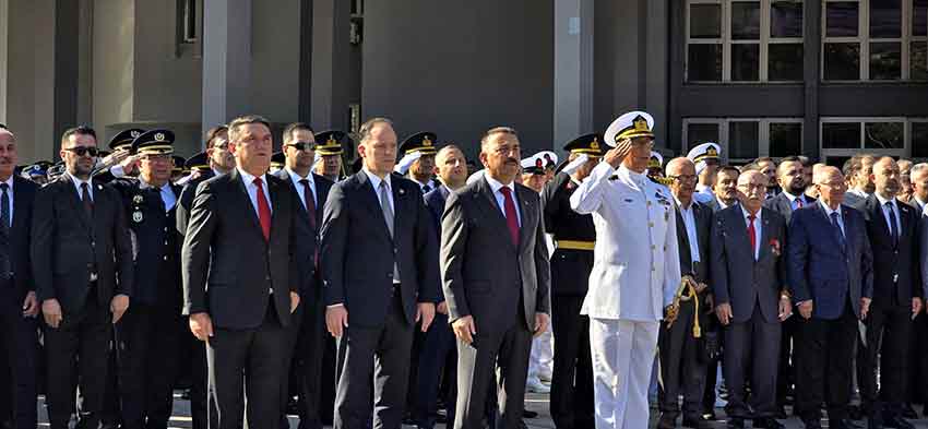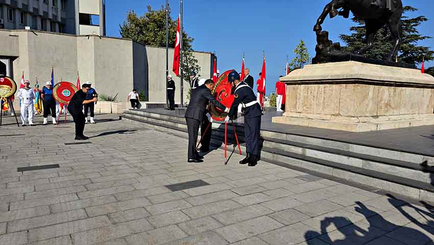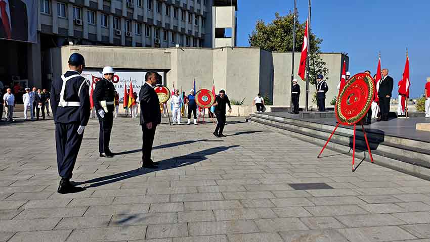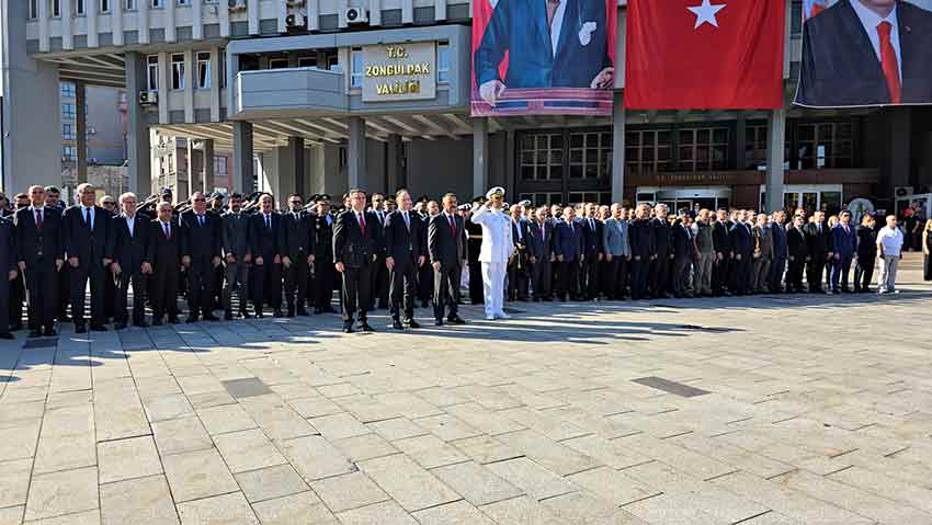 Törende, Vali Osman Hacıbektaşoğlu, Zonguldak Belediye Başkanı Tahsin Erdem ve Karadeniz Bölge Komutanlığı Merkez Komutanı Albay Mustafa Güzel, Atatürk Anıtı’na çelenkler sundu. Ardından şehitlerimiz için saygı duruşunda bulunuldu ve İstiklal Marşı okundu.